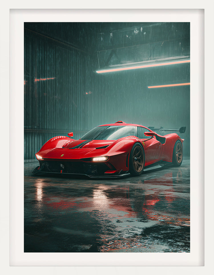 Apex Storm captures a modern Ferrari hypercar poised beneath industrial lights as rain falls across the concrete floor. The reflections, the posture and the razor-sharp design lines create an atmosphere that feels cinematic — as though the machine is waiting for its cue to erupt into motion.