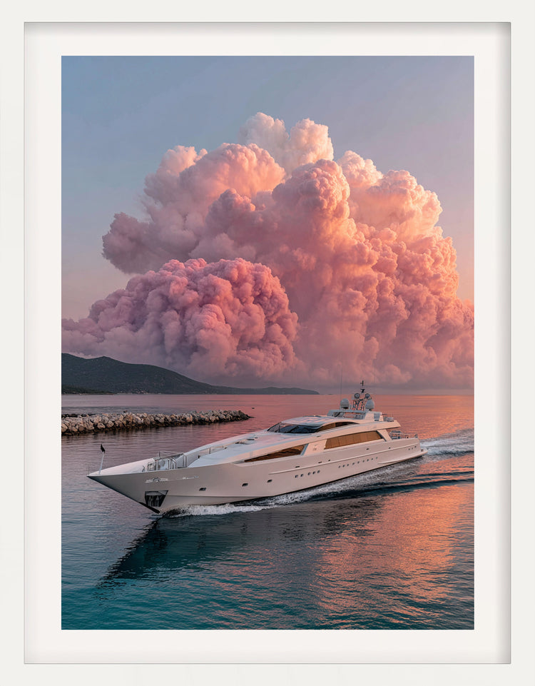 Aurora Voyager captures a breathtaking moment where nature and luxury collide. A sleek white superyacht glides across calm evening water as colossal pink thunderclouds bloom across the horizon like slow-moving fire. The soft, surreal light reflects across the hull, creating a dreamlike composition that feels both cinematic and impossibly serene. This artwork pairs hyper-realism with surreal atmospheric beauty—perfect for modern interiors seeking elegance with a bold visual presence.