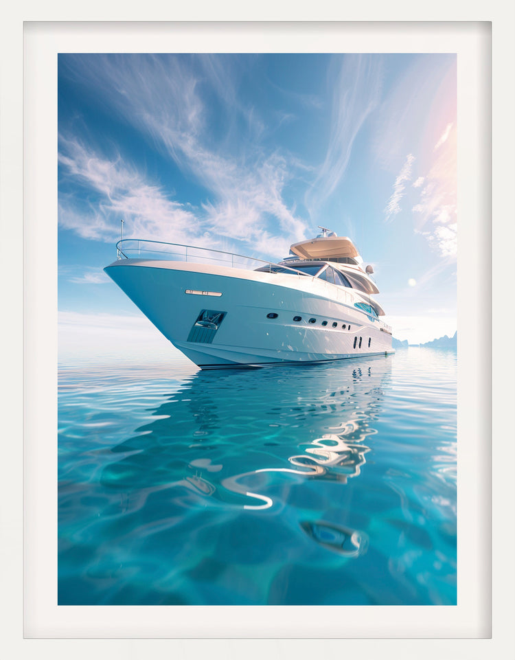 Azure Escape captures a luxury motor yacht gliding across impossibly clear blue water beneath a bright, sun-washed sky. The reflections ripple gently across the hull, creating a scene filled with calm, clarity and effortless elegance.