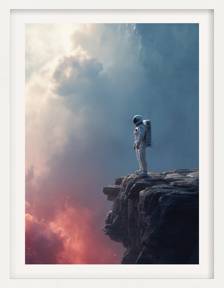 Standing at the boundary between the known and the infinite, Edge of Silence captures a solitary astronaut poised above a glowing, otherworldly horizon. The composition blends vastness and vulnerability — a single figure dwarfed by scale, yet elevated by purpose. Light drifts through clouds of colour, evoking both the cosmos and the subconscious.