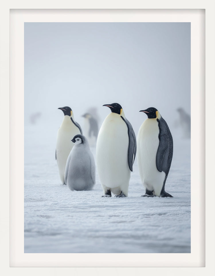 A moment of perfect stillness in the frozen world. Emperor’s Silence captures a small gathering of emperor penguins, cloaked in soft mist, their forms defined by quiet strength and elegant simplicity. The subtle palette of whites, greys, and golds reflects the beauty of restraint — where the world seems to pause and breathe.