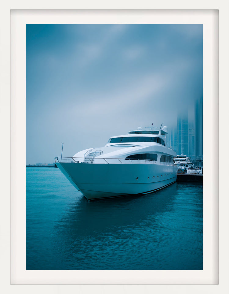 Harbour Majesty captures a moment of quiet luxury as a sleek white superyacht rests against a misty blue skyline. The soft haze, the still water, and the imposing bow create a sense of calm strength, making this piece feel both powerful and peaceful. It’s an artwork that whispers sophistication without needing to shout.