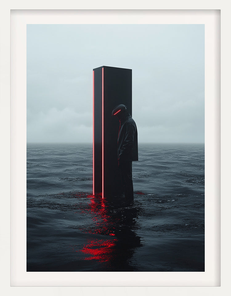 Neon Sentinel blends futurism with solitude, placing a lone figure beside a towering monolith glowing with sharp red light. Set against a stormy grey sea and low, heavy clouds, the scene feels both cinematic and otherworldly β a moment suspended between technology and nature.
