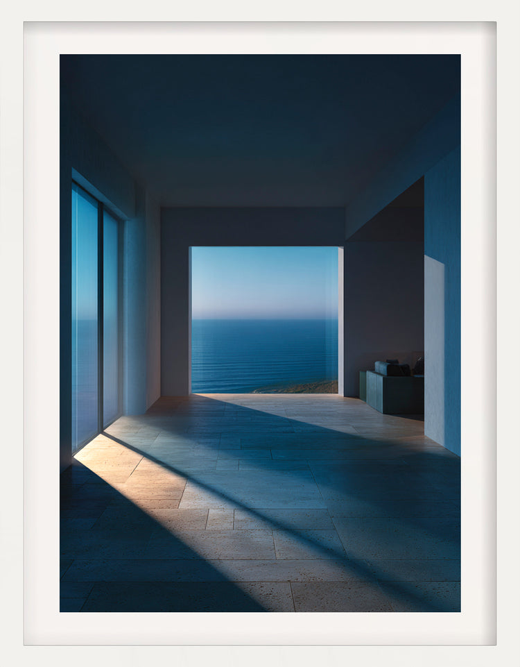 Soft dusk light spills across cool stone floors, leading the eye toward a perfectly framed horizon. The room is empty, still, and open — a sanctuary carved from shadow and ocean air. With its clean lines and deep blue tones, the space feels almost meditative, inviting the viewer to pause and breathe.