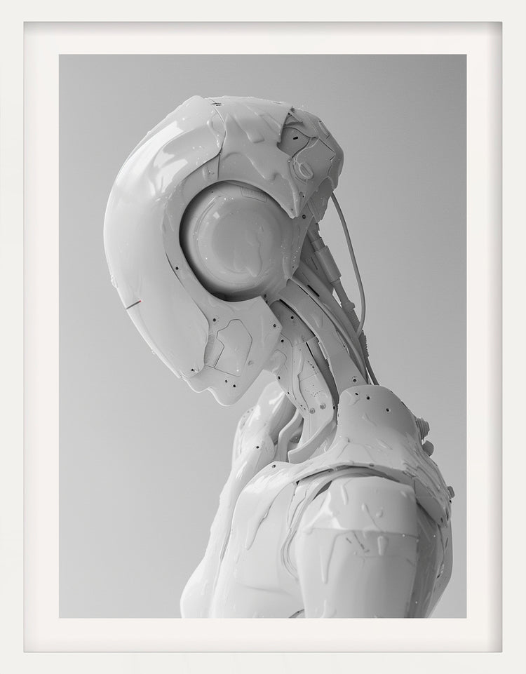 Silica Reverie explores the intersection of humanity and design — a portrait suspended between emotion and circuitry. The composition, sculpted in soft monochrome, transforms the mechanical into something almost meditative. Every curve and contour is rendered with tactile precision, revealing the quiet grace of engineered form.