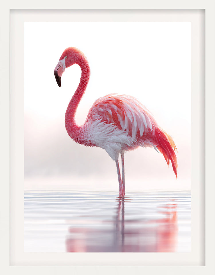 Solitude in Pink captures a single flamingo poised in the stillness of shallow water — a study in grace, restraint, and natural design. The soft interplay of pastel tones and mirrored reflection evokes quiet contemplation, balancing elegance with simplicity. Every feather, every ripple of light, appears suspended in timeless calm.