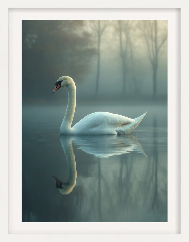A lone swan drifts across a glass-calm lake, its reflection perfectly mirrored in the quiet morning water. Soft mist hangs over the forest in the distance, blurring the world into gentle shapes and muted tones. Every detail — the curve of the neck, the still surface, the whispered atmosphere — feels serene and deeply poetic.