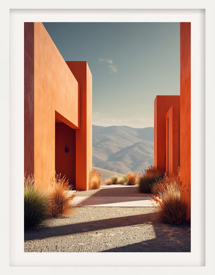 In Terracotta Horizon, geometry and nature meet in an exquisite balance of light and colour. Bold architectural lines frame the sweeping mountain vista beyond, where the warm terracotta facades echo the earth’s natural palette. This composition evokes a grounded stillness — a quiet moment where structure and landscape exist in perfect dialogue.