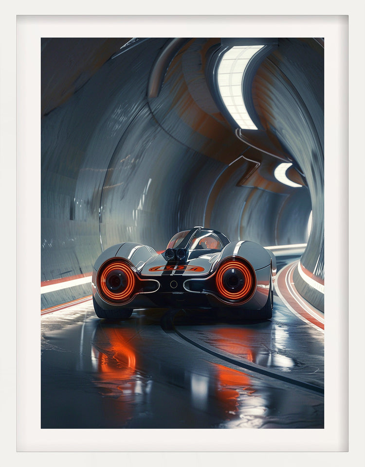The glowing rings of its tail lights cut through the cool sheen of the tunnel, creating a hypnotic rhythm of orange against steel. This piece embodies the spirit of innovation — the perpetual pursuit of perfection that defines automotive art. Both modern and timeless, it invites the viewer to feel the momentum, the hum of energy, and the beauty of controlled velocity.